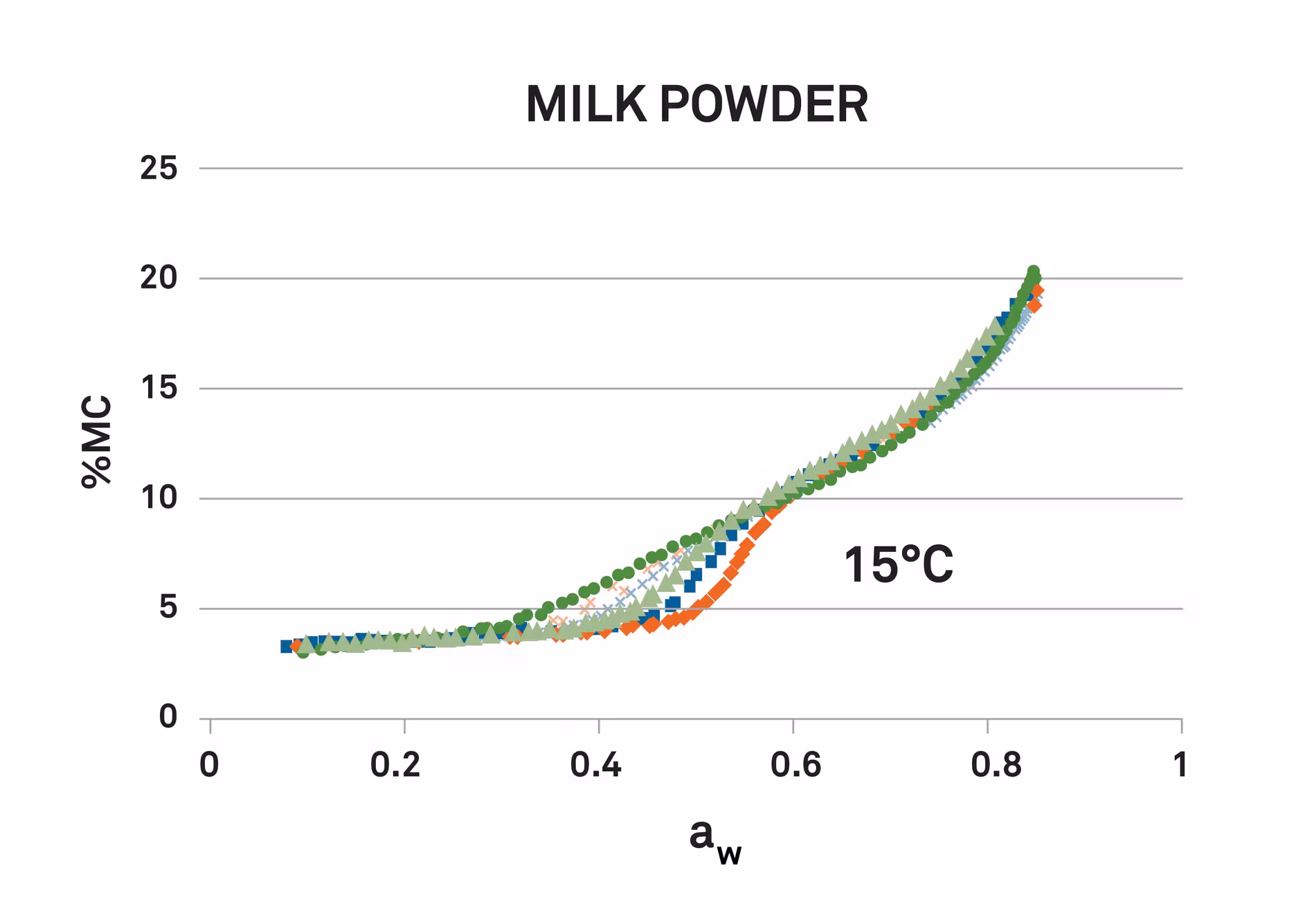 Generally speaking, water activity increases as temperature increases. With this in mind, it's essential to have a range of isotherms for powders so you can assess and predict how the critical water activity might change as the product leaves the facility and is affected by outside conditions. With different isotherms at different temperatures, we can predict the water activity at nearly any temperature.