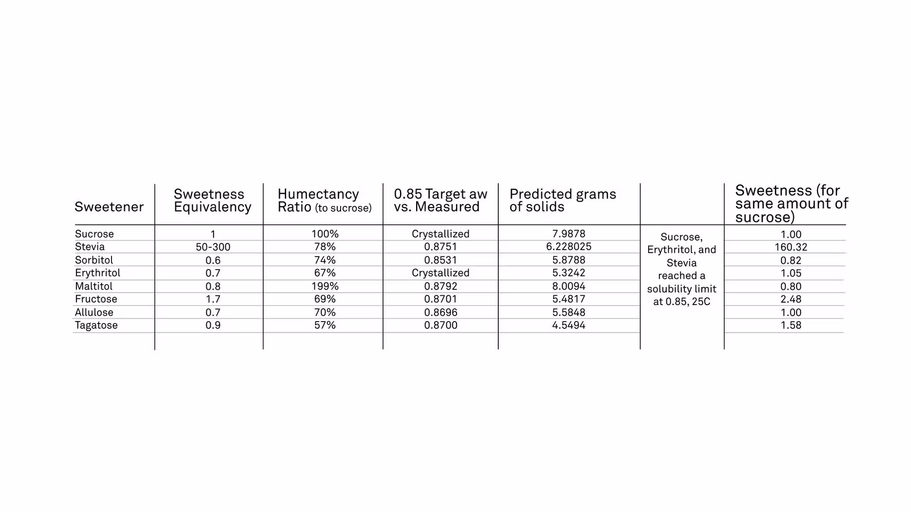 100% would be the same amount as sucrose, and then all the other ones, and most of them are less, it would take less of that sweetener to produce a similar effect, a similar binding effect to the water. That was a little bit of a surprise because sucrose is known to be a really, really good humectant, and then we turn around and we look at these natural sweeteners, and we say, "Ah, they can actually be better at it than sucrose can." I found that was really, really interesting. One of the things I wanted to add on the table too is, "Okay, so what if we added the same amount of sugar in our formulations? What are we going to get sweetness-wise?," and so I have this little bit on the end of my table, sweetness for same grams of sucrose, so if we added the same amount of these sweeteners, how sweet are they going to be, and so I just took an average for stevia, so like 160 times as sweet, and I felt maybe gave another way to look at this data.